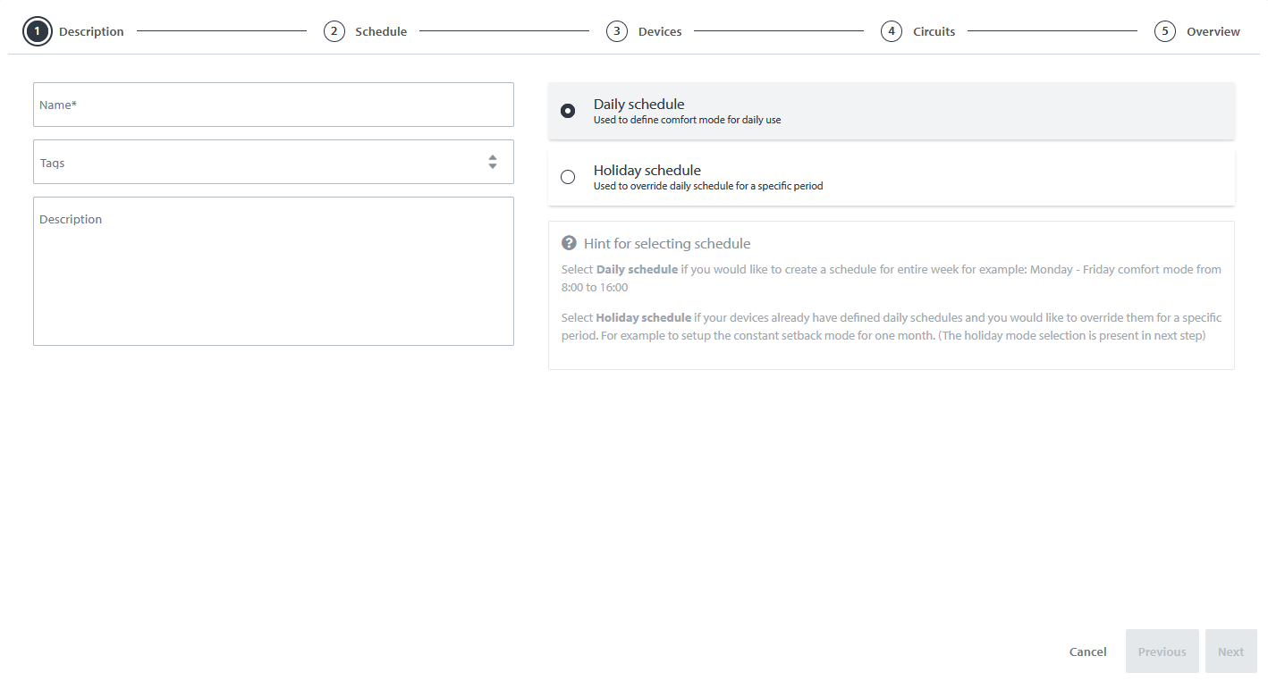 I det første trin i oprettelsen af en delt tidsplan skal du indtaste navnet på tidsplanen og vælge tidsplantype. Du kan også tildele tags og tilføje en beskrivelse af tidsplanen.