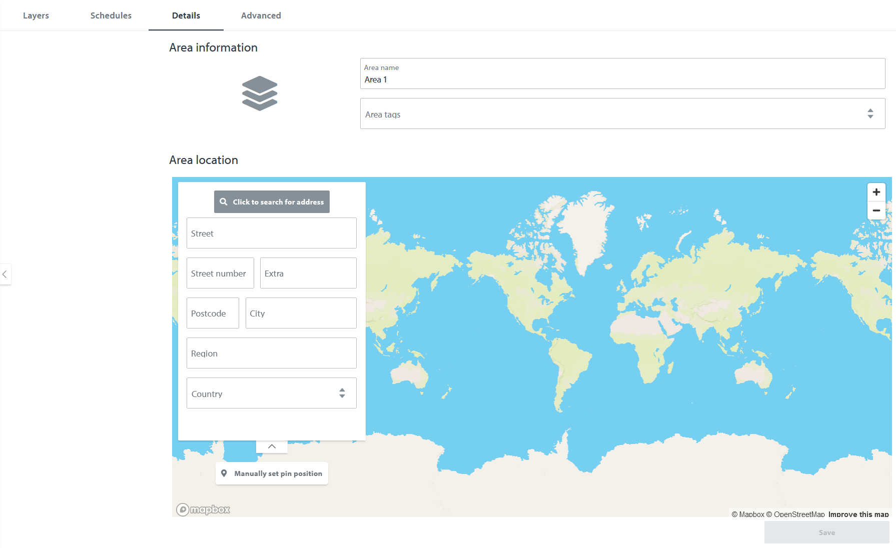 - dem Bereich einen Standort zuweisen (dies ist erforderlich, um den Bereich auf der Karte zu sehen)