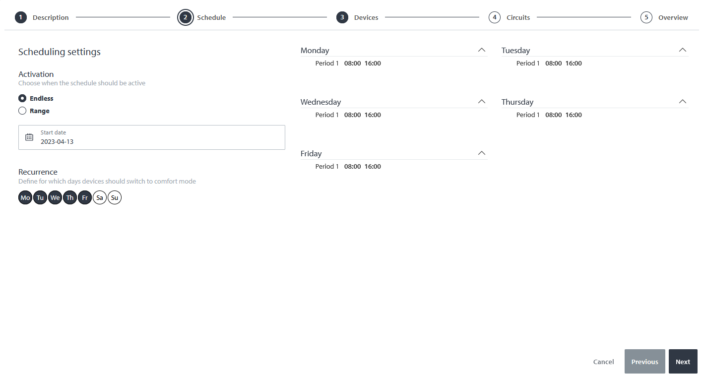 Beim Erstellen eines Urlaubsprogramms ist es außerdem notwendig, den Modus auszuwählen, auf den die Geräte umschalten sollen (Urlaubskomfortmodus, konstante Absenktemperatur oder Frostschutz). Unterhalb der Datumsauswahl können Sie die Wochentage markieren, an denen das Programm aktiv sein soll. Auf der rechten Seite können Sie außerdem tägliche Zeiträume für das Programm festlegen.