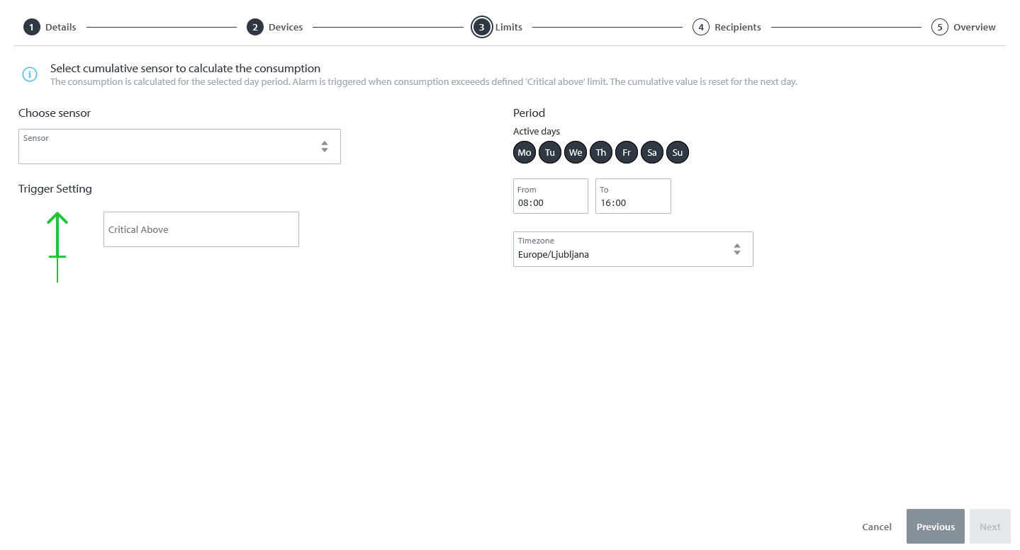 Im nächsten Schritt wählen Sie den kumulativen Sensor aus, auf dem dieser Alarm beruhen soll, und geben einen Auslösewert an. Wenn der Verbrauch (auf Energie- oder Volumenbasis) den eingestellten Wert für den vorgegebenen Zeitraum des Tages überschreitet, wird der Alarm ausgelöst. Auf der rechten Seite können Sie den Zeitraum für den Verbrauchsalarm konfigurieren.