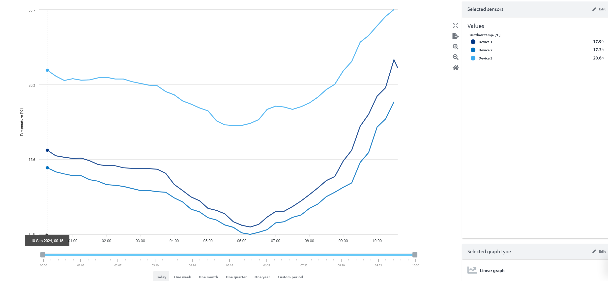 Sobald die Geräte ausgewählt wurden, können Sie bis zu 2 verschiedene Sensoren auf diesen Geräten zum Vergleichen auswählen. Dies können Sie über das Menü auf der rechten Seite des Bildschirms tun. Hier ist es auch möglich, den Diagrammtyp von einem Liniendiagramm zu einem Balkendiagramm zu ändern.