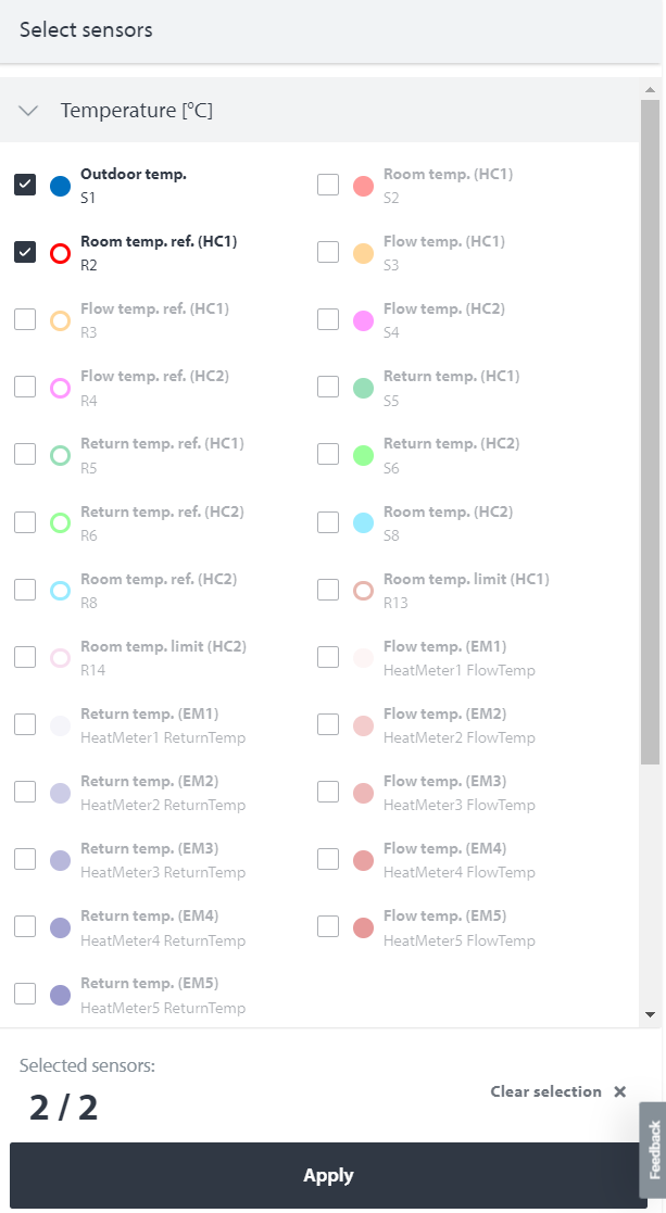 Um ein Gerät zum Vergleichsdiagramm hinzuzufügen, wählen Sie es einfach im Menü auf der linken Seite des Monitors aus. Es können Sensorwerte von bis zu 50 verschiedenen Geräten gleichzeitig angezeigt werden. Wir haben es auch möglich gemacht, bereits vorhandene Filter für Geräte zu verwenden.