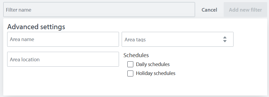 Enter the filter name. Under "Advanced settings" you can enter the filter parameters based upon which the areas will be filtered. You can filter based on area name, area location, area tags (entered in the details page of each area) and schedules. Once you enter the filter parameters click "Add new filter" in the top right corner of the filter menu. To edit existing filters, click on a filter and then on the right side of the screen click "Show advanced settings".
