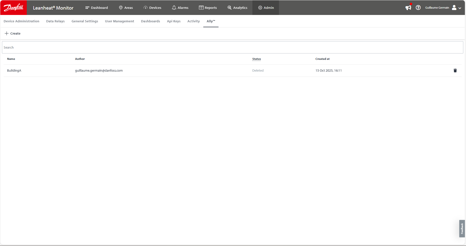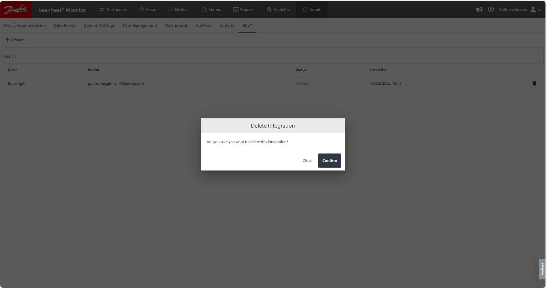 ⚠️ Warning: Removing integration is permanent. You'll need to create a new integration with a new pairing code if you want to reconnect. Your device data in Leanheat Monitor (alarms, classifications, area assignments) will not be automatically deleted but will no longer sync with Ally devices.