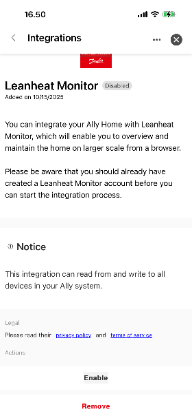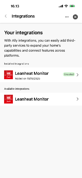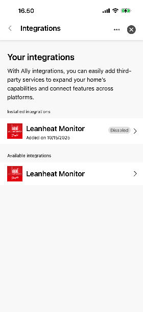 💡 Tip: If you're troubleshooting or need temporary control back in the Ally App, use Disable. If you're permanently switching away from Leanheat Monitor, use Remove.