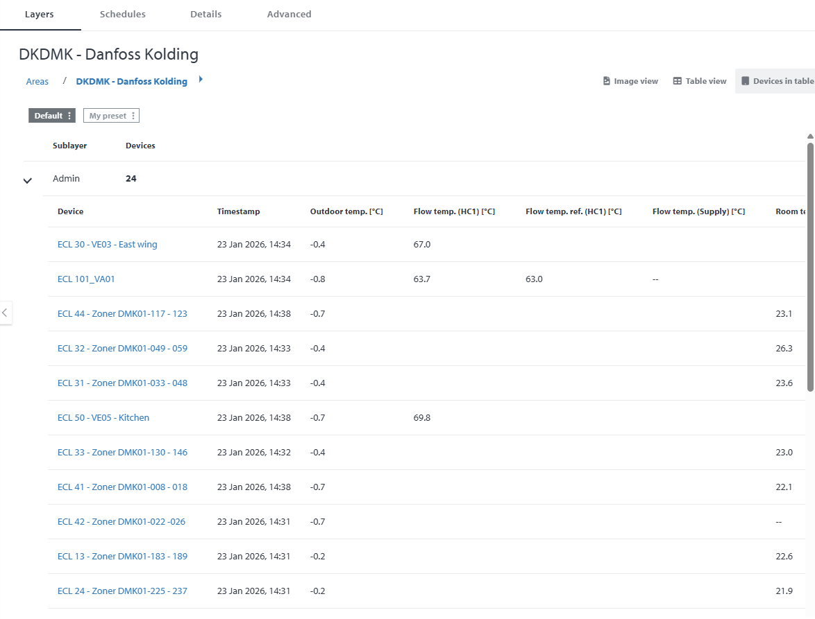 Devices can now be viewed in a table format within the areas tab