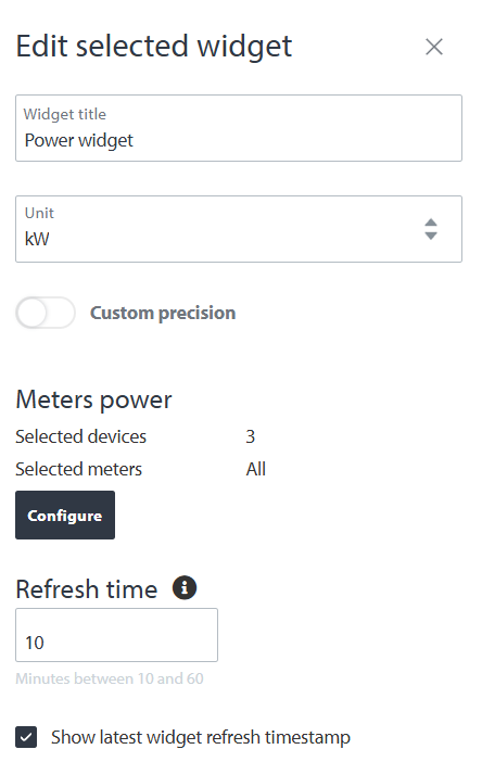 You can name the widget, enable or disable timestamp of latest measurement, select the displayed unit and set a custom decimal precision. To configure the widget in the widget edit mode click "Configure" and select the devices and their meters with values that you would like to include into the widget. You can also set the refresh period of the widget (10-60 minutes).