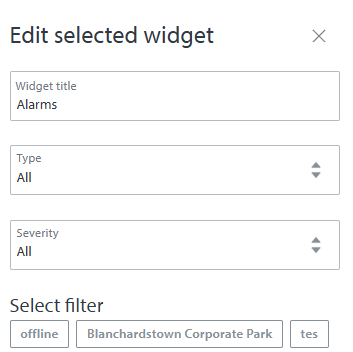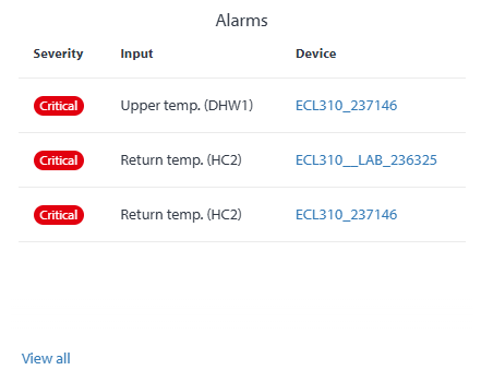 The alarm widget displays currently active alarms. You can use the device filters previously set in the "Devices" tab to only display alarms from certain devices. The widget can be set so it displays either all currently active alarms, only critical or only warning alarms. You can also edit the widget so it only displays a certain alarm severity (warning, critical or all).