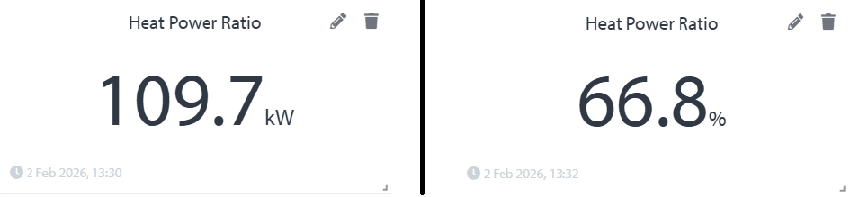 The heat power ratio widget shows the difference between power A and power B. For example, widget can be used to calculate the difference in actual power between meter(s) used to track heat production and meter(s) used to track heat consumption.