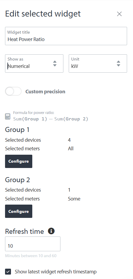 You can display the value as numerical or in percentage in case you want to display power losses. You can name the widget, select the unit to be displayed, set custom decimal precision, enable or disable timestamp of latest measurement and set the refresh time of the widget (10-60 minutes). To configure the meter groups click "Configure" under "Group 1" or "Group 2". Select the devices where the meters are connected to and in the last step of the configuration select the meters from the devices for each group.
